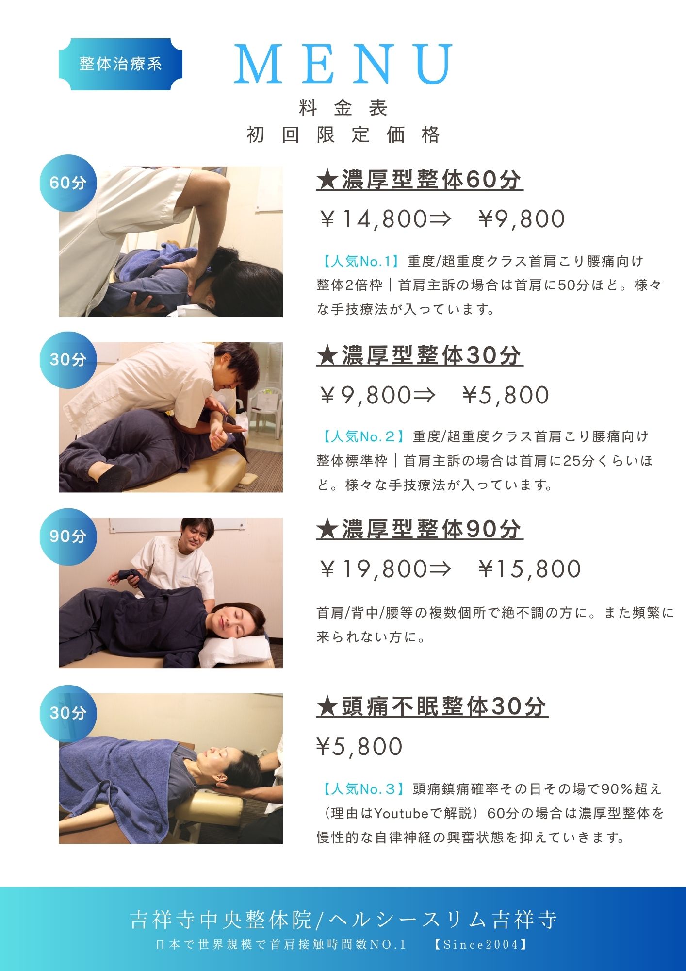 やっている事は濃厚型整体とほぼ同じ。首や頭に掛ける時間を増やしています。