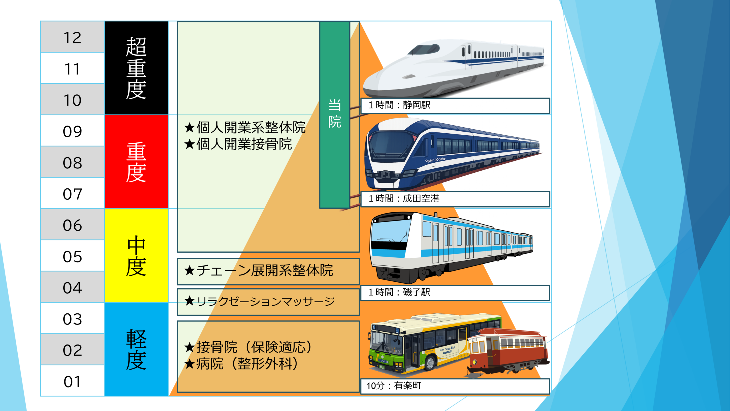 1が良い。12が悪い。1は首肩こり腰痛が無い人。12は国指定難病認定を受けている方の中でも当院まで歩いて来れる人。実際に当院に来られる方のボリュームゾーンは8~10です。8~10の方は一般的な整体院に行かれても不完全燃焼で終わる事が多いです。